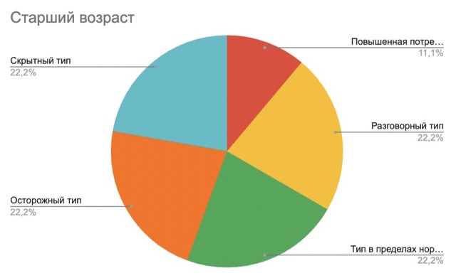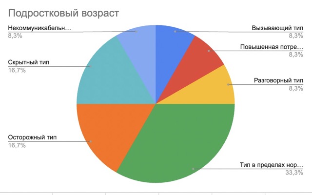 Среди подростков сложно выделить определённый доминирующий тип. Такое распределение результатов среди группы подростков в возрасте от 13 до 18 лет может быть связано с различными факторами. Вот некоторые возможные объяснения: