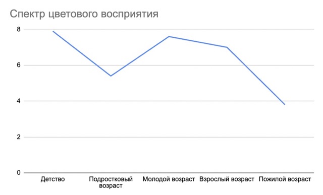 Мои исследования показали, что разные возрастные группы имеют разные типы восприятия информации в рекламе. Среди детей до 12 лет наиболее распространёнными типами восприятия были зрительное и эмоциональное восприятие. Молодые люди в возрасте от 19 до 35 лет имели преимущественно когнитивный тип восприятия, а взрослые в возрасте от 36 до 55 лет были более склонны к яркой рекламе. У пожилых людей в возрасте 56 лет и старше, а также у подростков в возрасте от 13 до 18 лет наблюдался наименьший интерес к рекламе с тусклыми цветами.